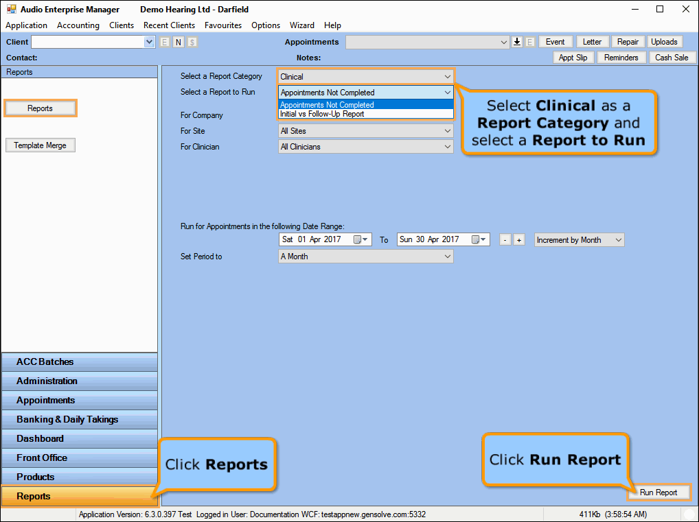 Clinical Reports give information relating to Client Conditions, Appointments and Treatments linked to those conditions.