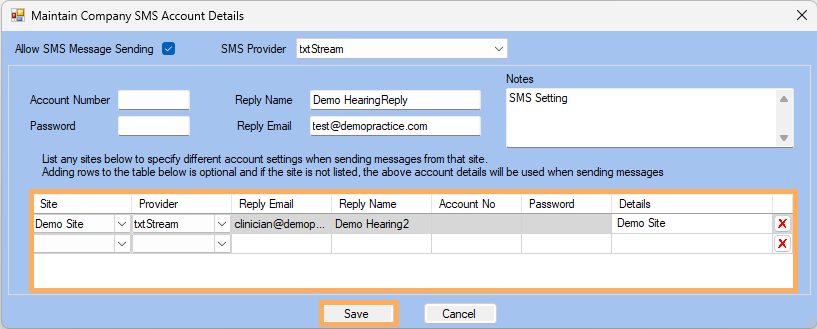 9. The Companies "Demo Hearing Ltd" is now ready to send SMS Messages