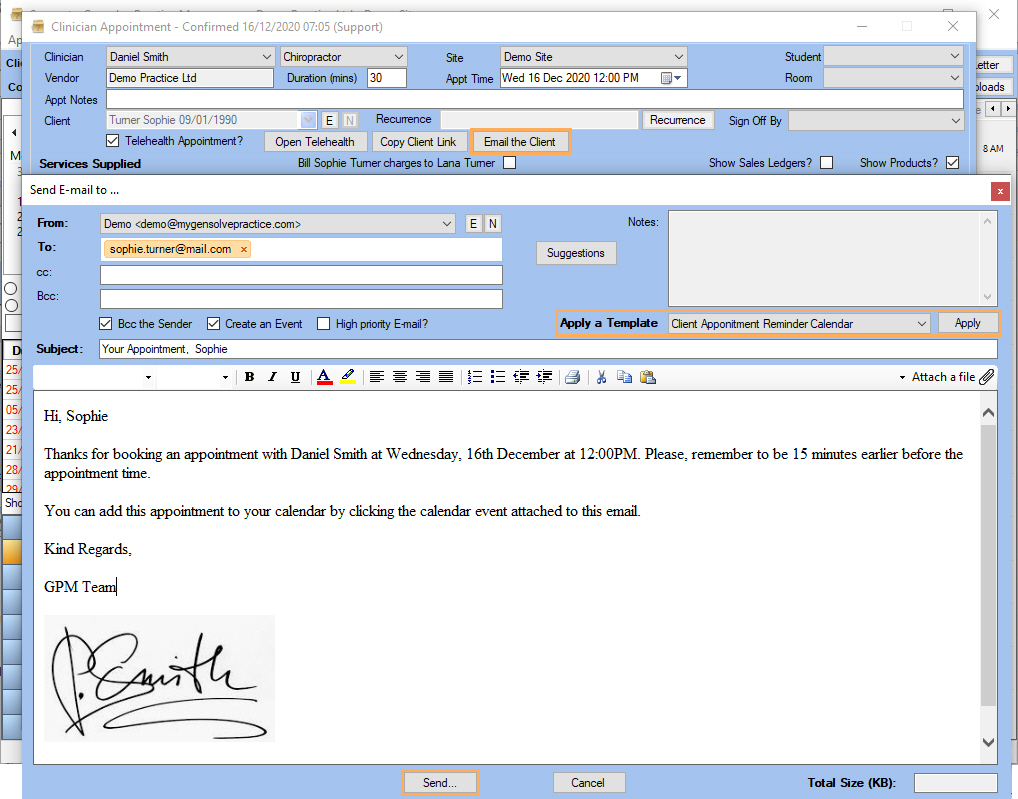 2. Open the appointment and click on the button Email the client. Both ways will display a Send Email to... window >> On Apply a Template, make sure to select the Email Template created on the previous section of this tutorial >> Fill the From field and validate the rest of the information >> Click on Send.