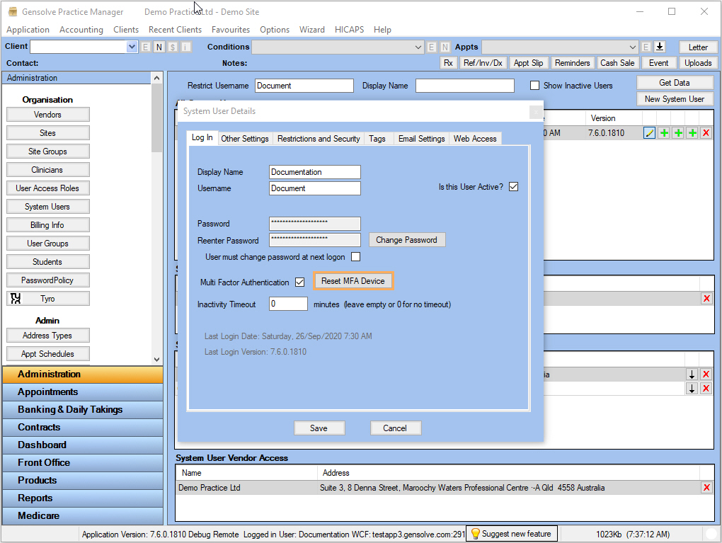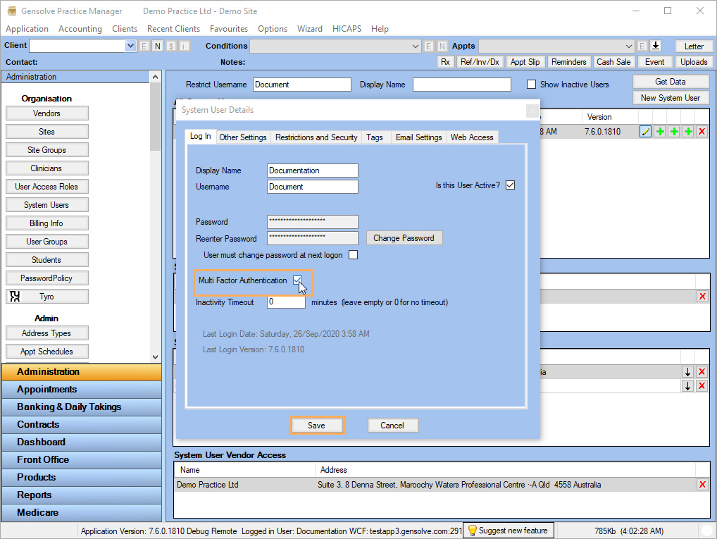 2. On the System User Details window, mark the Multi Factor Authentication checkbox >> Save
