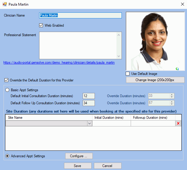 - You will be able to override the default duration for each provider by setting up the Basic Appointment Settings (Initial and Follow Up appointments) or activating the Advanced Appointment Settings to include service charges within the Clinic Portal. For more information see: Setting Up Service Charges for the Clinic Portal.