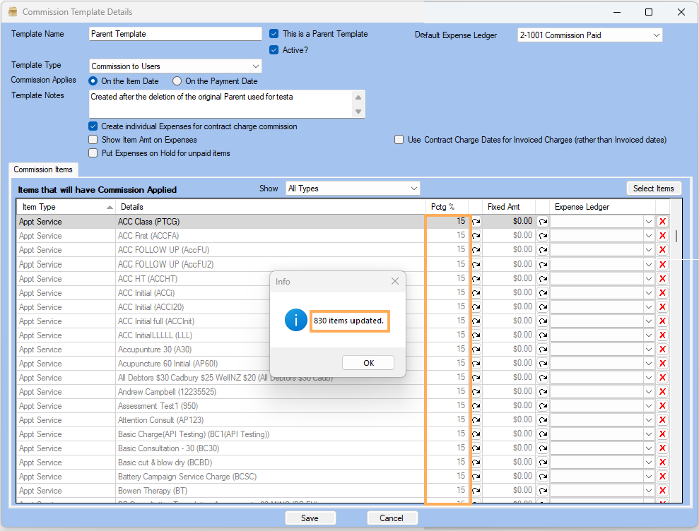 - Select the Item Type (Contract Charge) and Item(s) that will have Commission Applied and Save