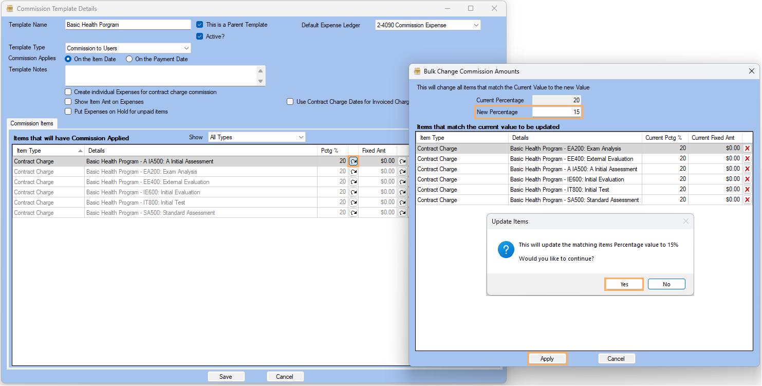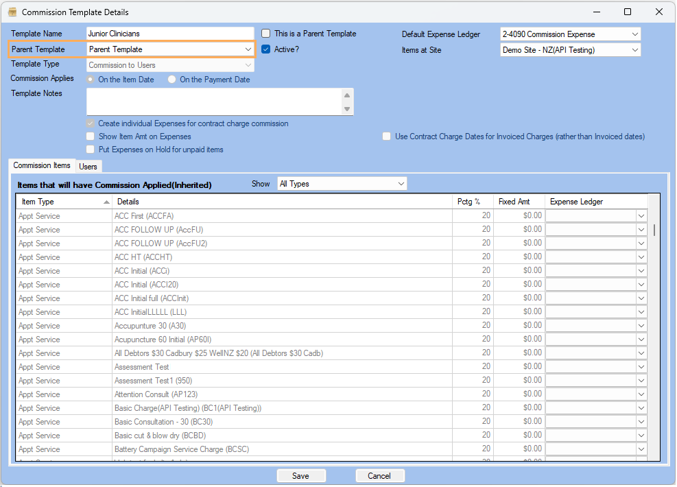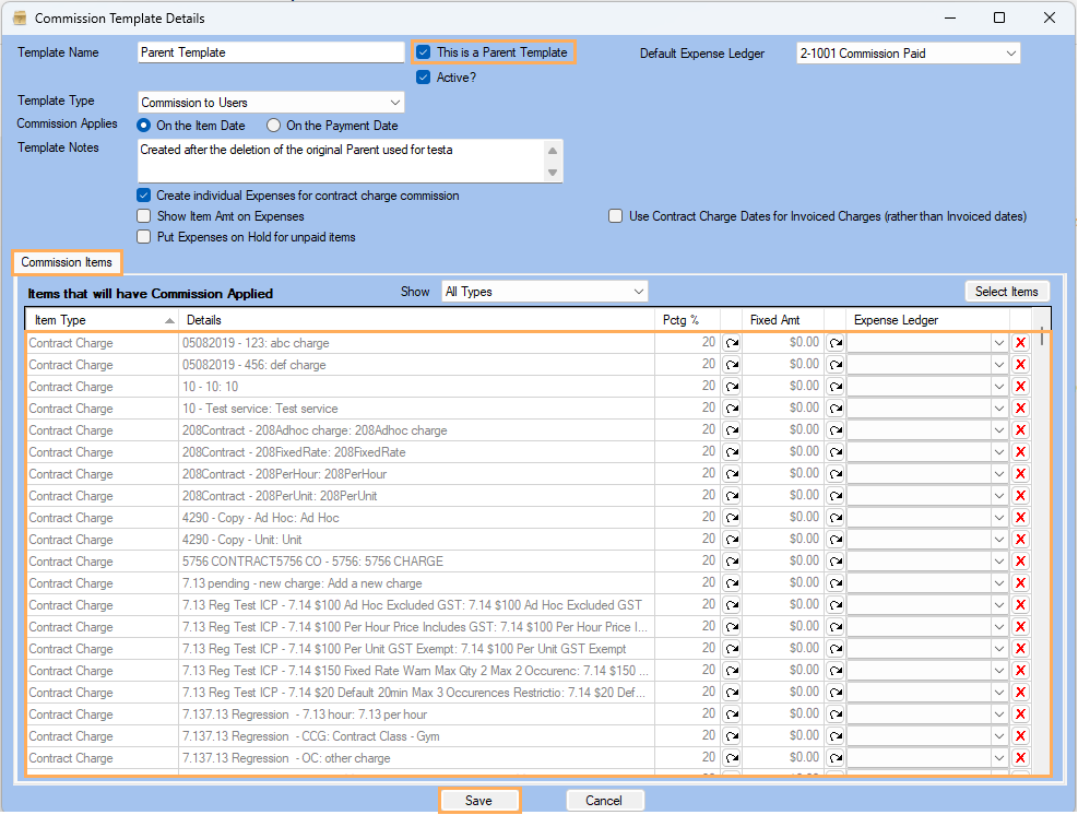 - Select the Parent Template you wish to apply to the Template >> the Items that will have Commission Applied is updated to the Parent Template rates immediately. You no longer need to edit each line against each Commission Template.