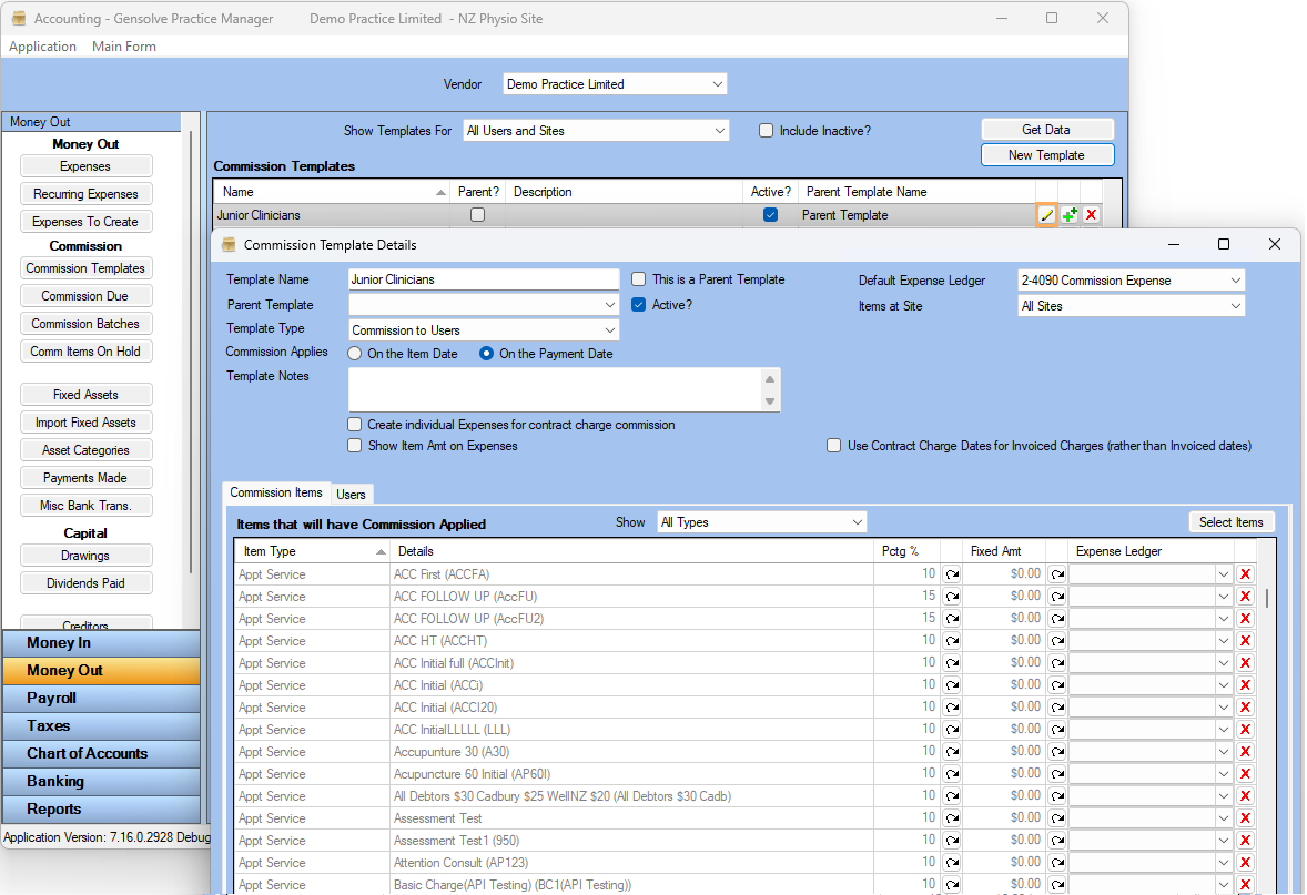 - Then enter the Commission Items. For more information please see Create a User Commission Template or Create a Site Commission Template on how to add Charges and Rates to Commission Templates.