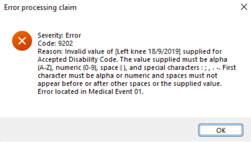 This code is a validation error that occurs when one or more values in the claim do no meet the rules expected by Medicare. This error can vary depending on which field is affected. If you encounter this error, ensure the Injury Description in the Condition meets the following format: