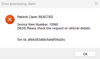 Check servicing provider details. May not be able to provide the service for this item at date of service. For more information, call the eBusiness Service Centre. |