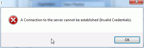 The message "A Connection to the server cannot be established (Invalid Credentials)" is displayed when logging in to GPM.