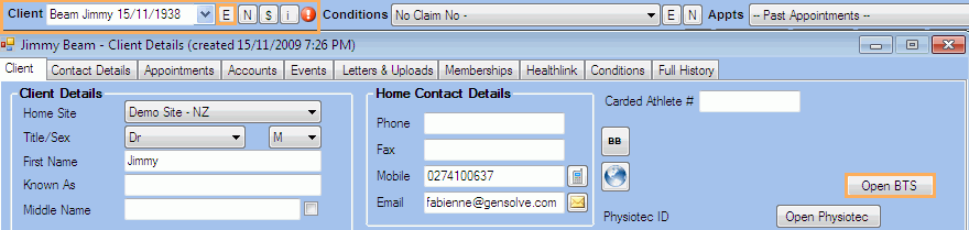 to open the Client Details window - On the right hand side of the Client tab, click on Open BTS to open the BTS website.
