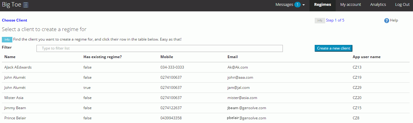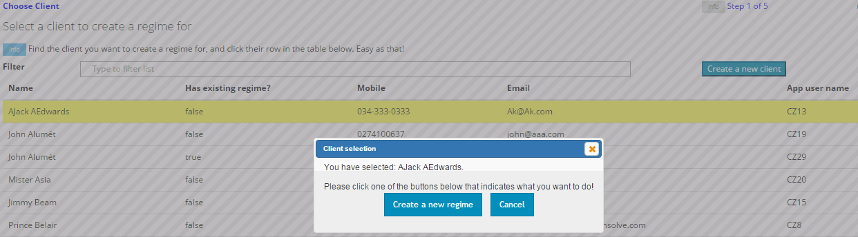 Note: to create a new regime for a specific client simply click on a client in the list.