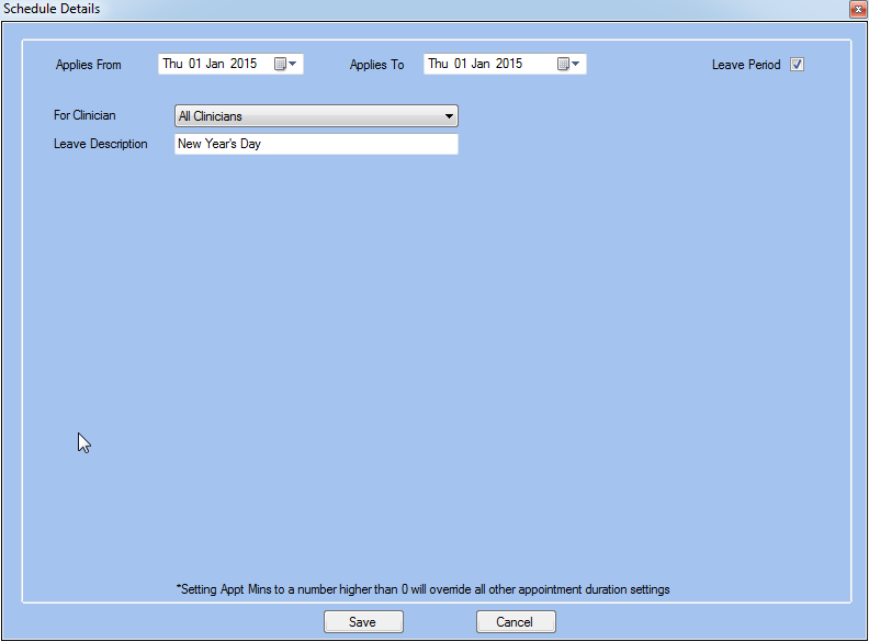 - Select All Clinicians in the For Clinician field to show that the public holiday applies to all staff