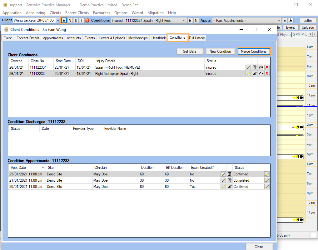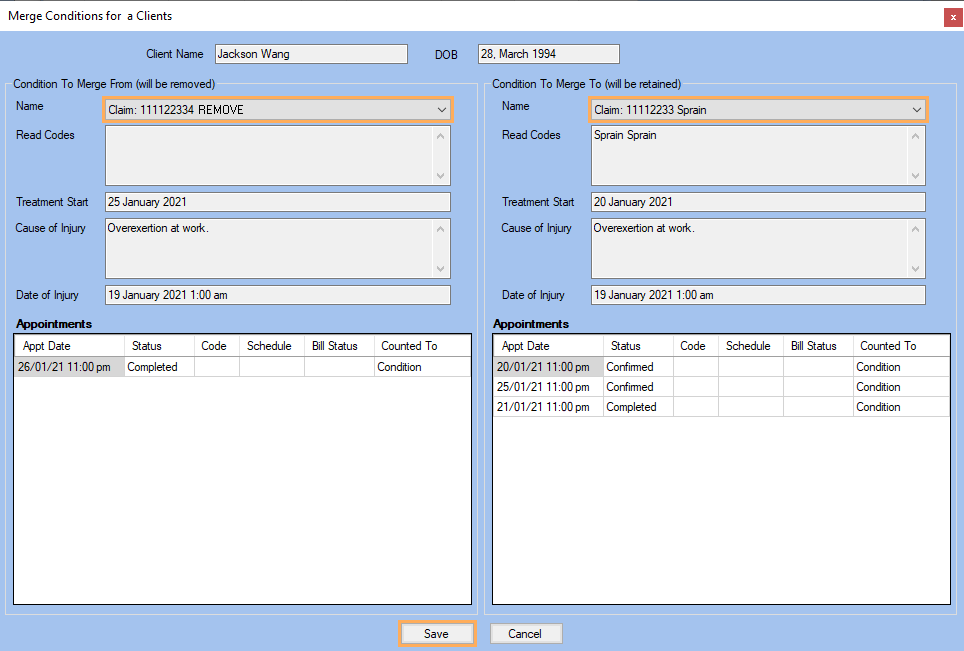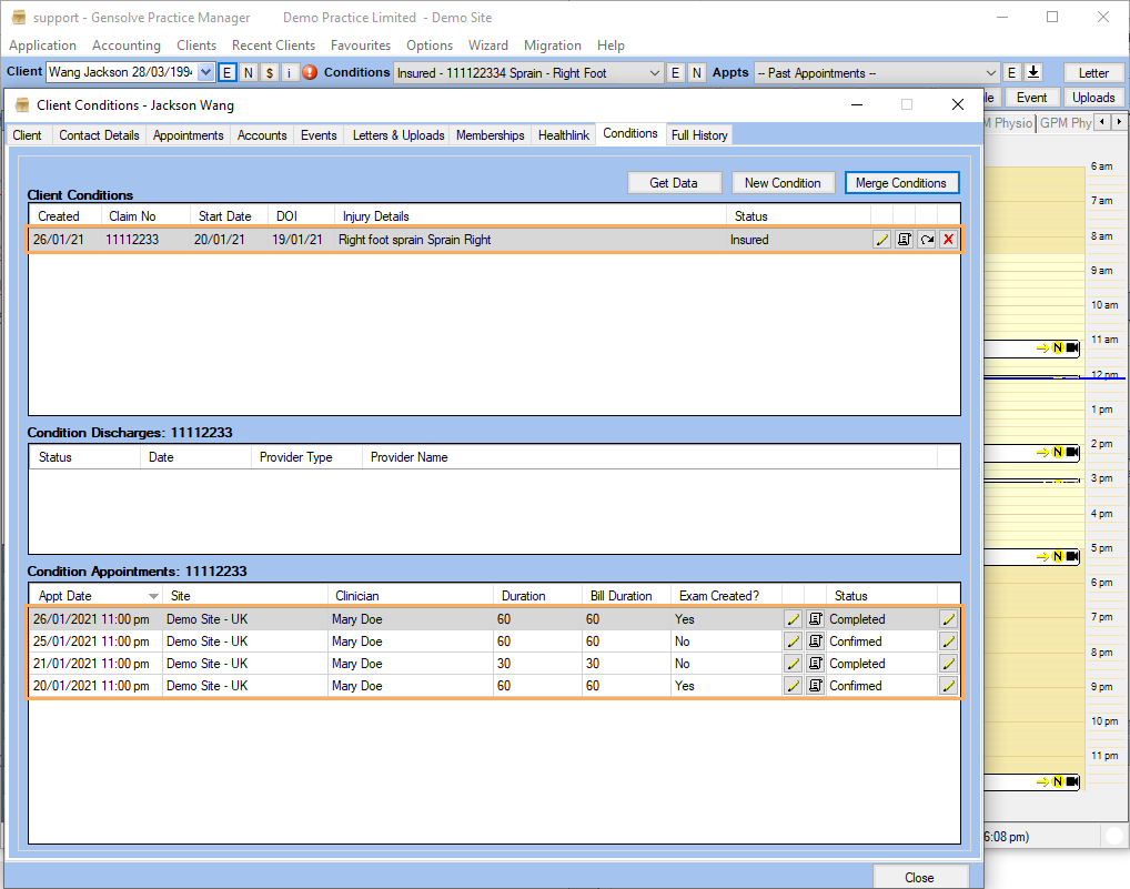 5. Now, on the Conditions tab, the Appointments and Medical Notes from the merged Condition are linked to the retained Condition.