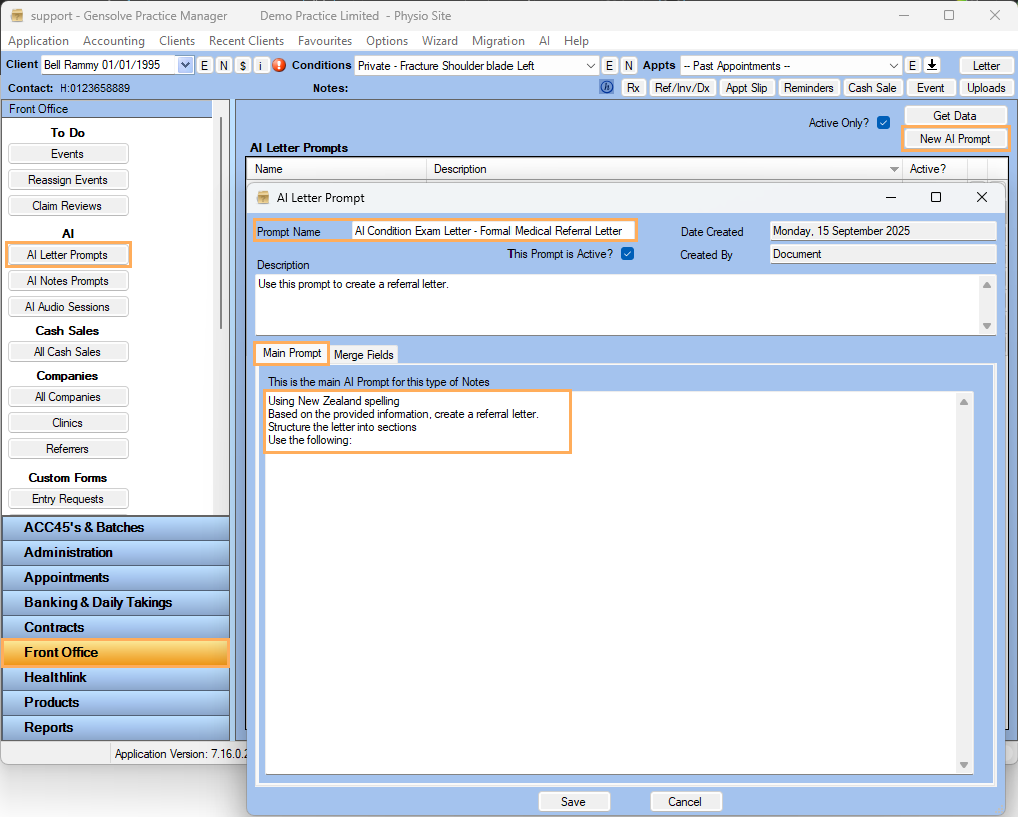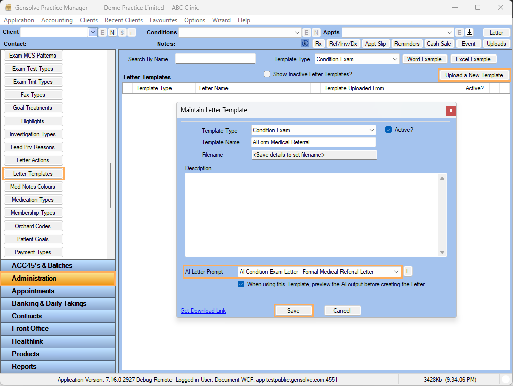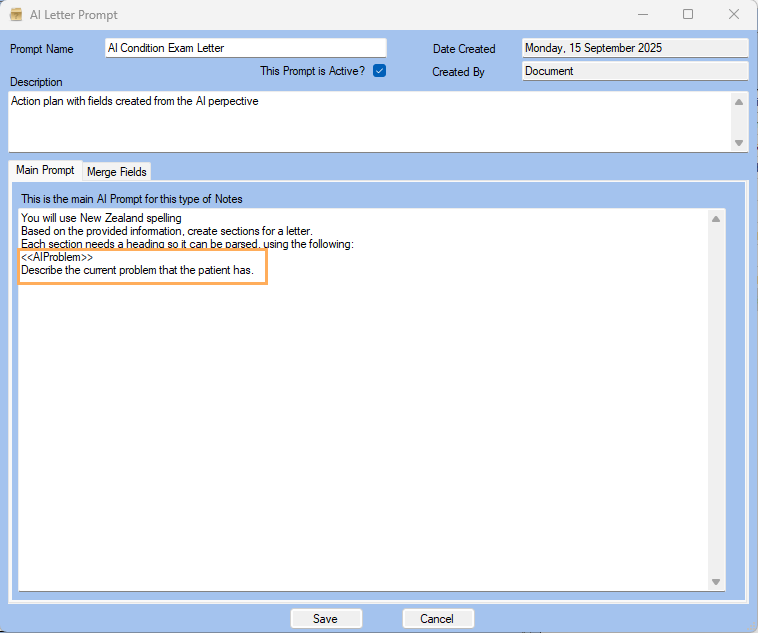 Note: You can use existing Letter Template Merge Fields in combination with AI Letter Merge Fields. The below example shows an existing Letter Template > Type: Condition Exam where the body is being updated with the AI Letter Tags previously created. Whilst the below shows how to create new AI Letter Merge Fields in a Word document.