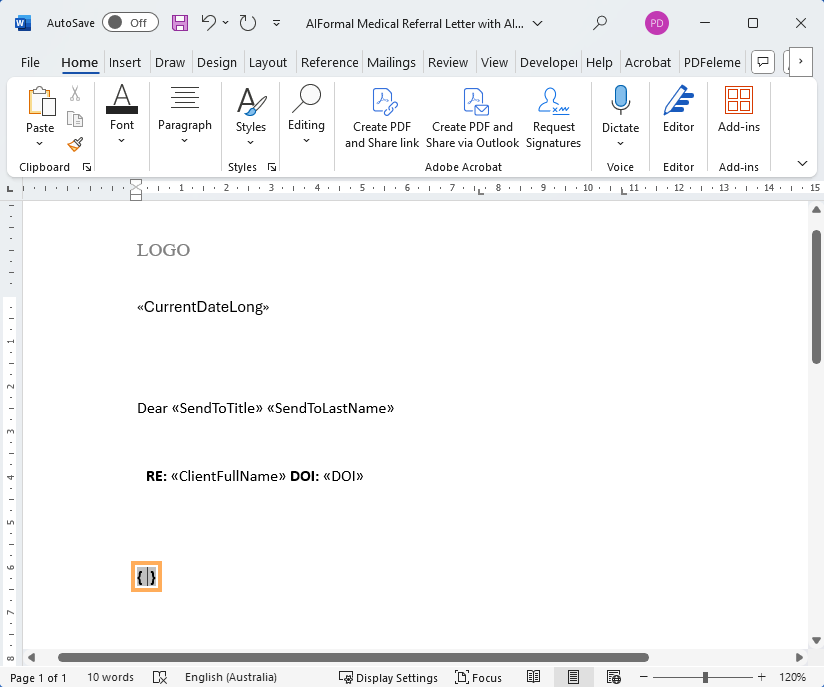To embed your newly created AI Letter Merge Fields, hit Ctrl + F9 for the {} to appear as seen in the screenshot below.