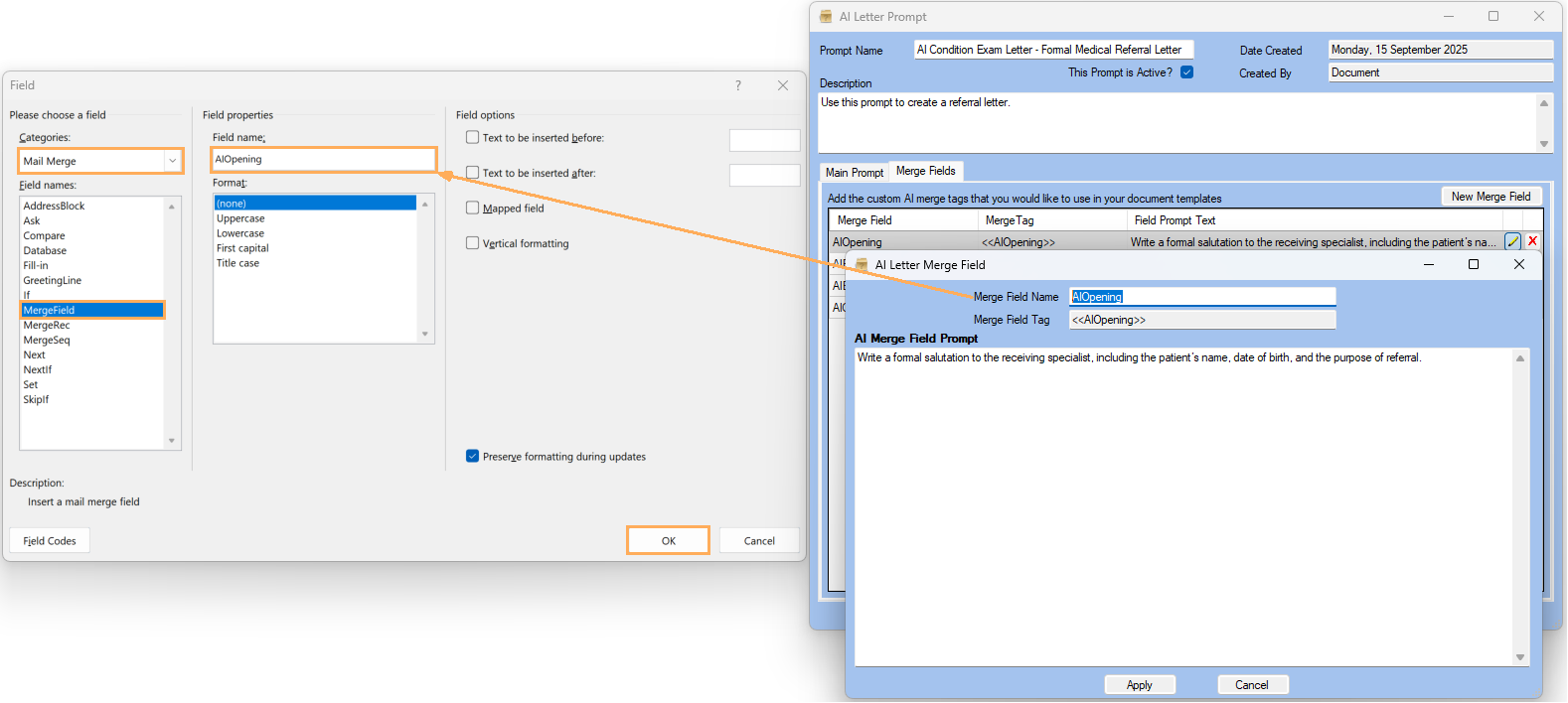 The AI Letter Merge Field will now be updated on the document, and will appear as any other Letter Template Merge Field. We recommend using the prefix AI in front of the name of your AI Letter tag, so that it is differentiated from standard Letter TemplateTags/ Merge Fields. For example <<AIOpening>>