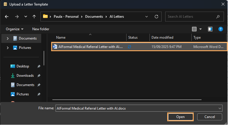 The Upload a Letter Template window will open >> Select your previously saved Letter Template >> Click Open