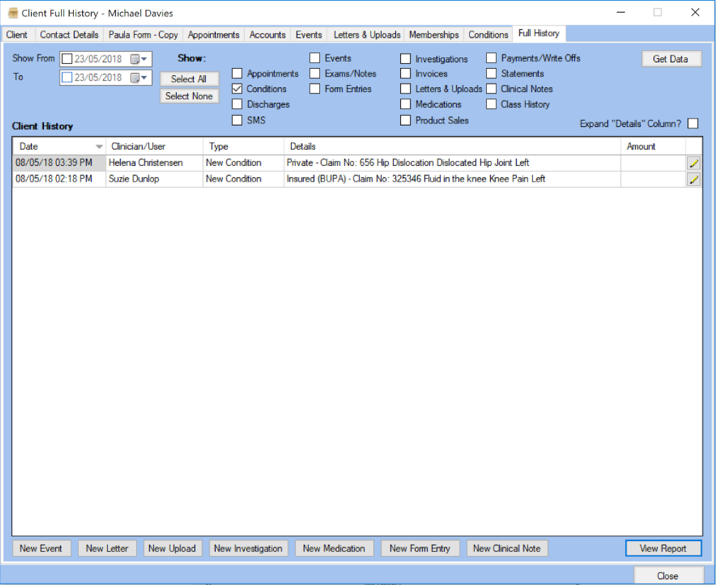 Export related data (conditions, appointments, notes, etc.) from the Full History tab of the a client’s file using either Report feature or F7.