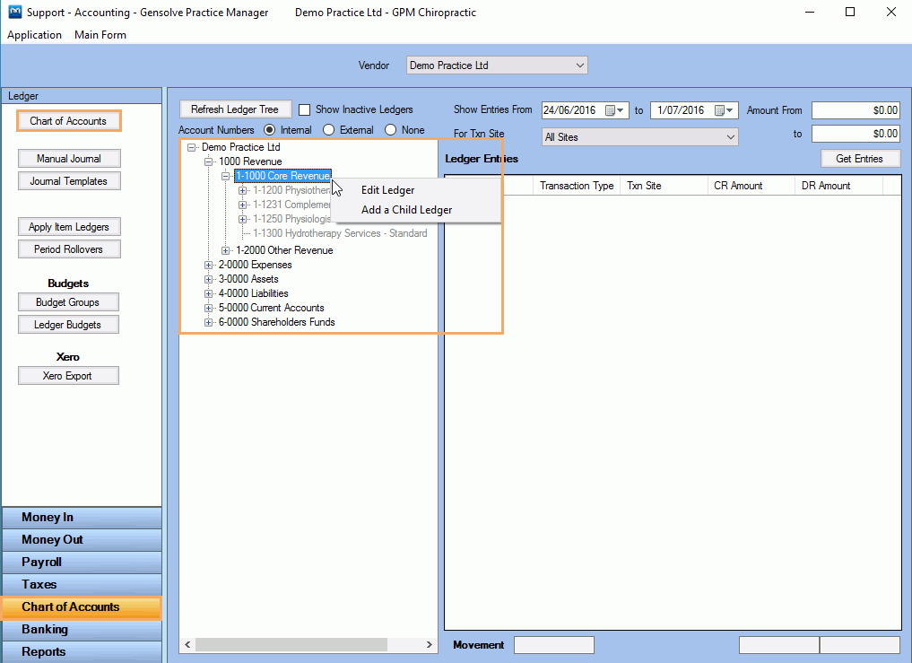 - Right-mouse click on item in the tree structure and select Add a Child Ledger or Edit Ledger.