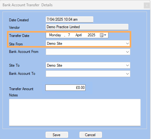Note: If a Default Transfer Bank Account has already been setup on the transferring Bank, it will automatically appear on the Bank Transfer screen