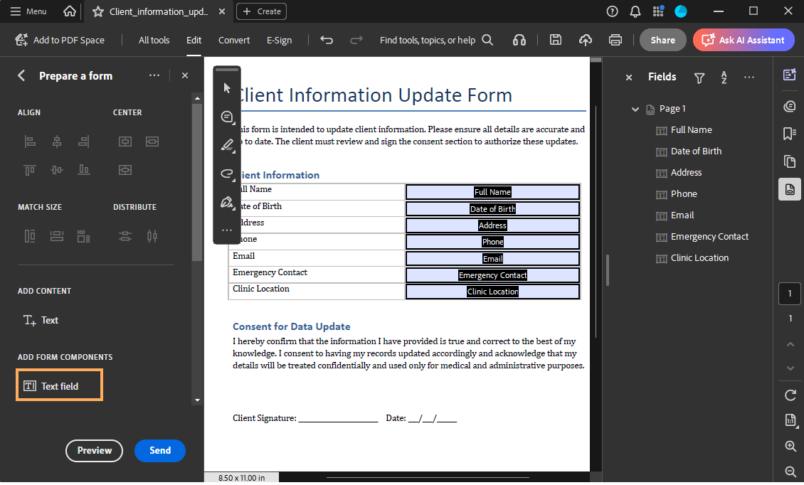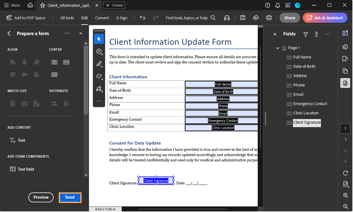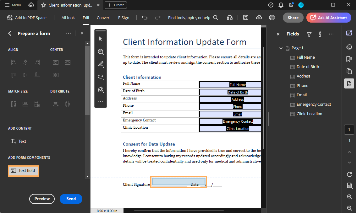 Follow the steps below to convert a standard PDF into a fillable PDF and add form fields. Once you have a fillable PDF, you can insert merge fields into it. This way, every time you create a letter template using this type of PDF, the merge fields will automatically be filled with the corresponding data.