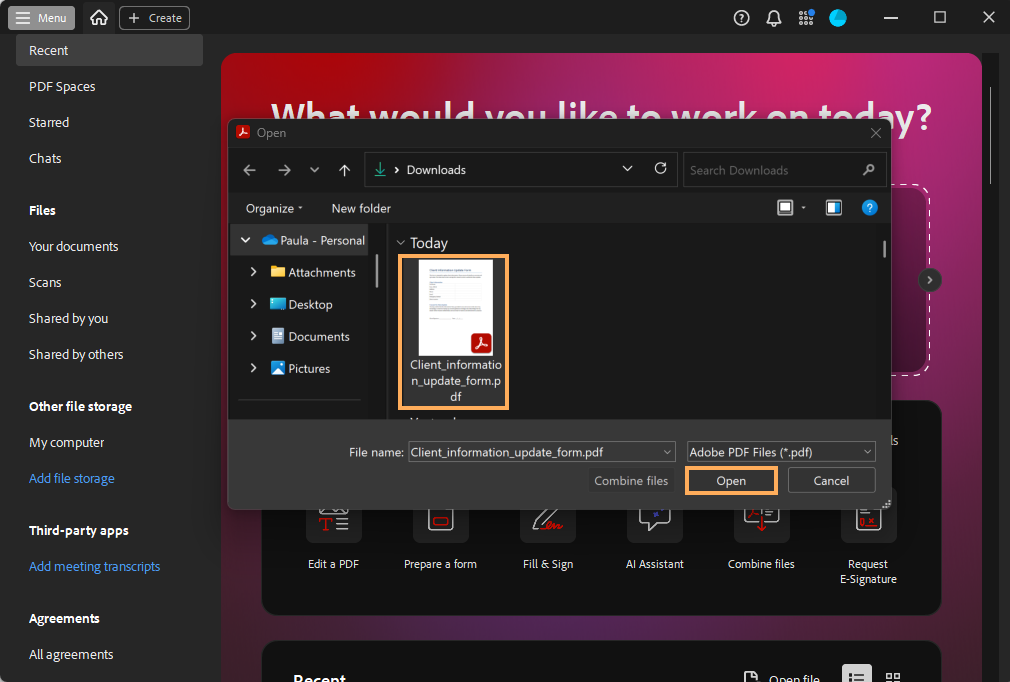 3. Select the PDF with Merge fields and click on Open.