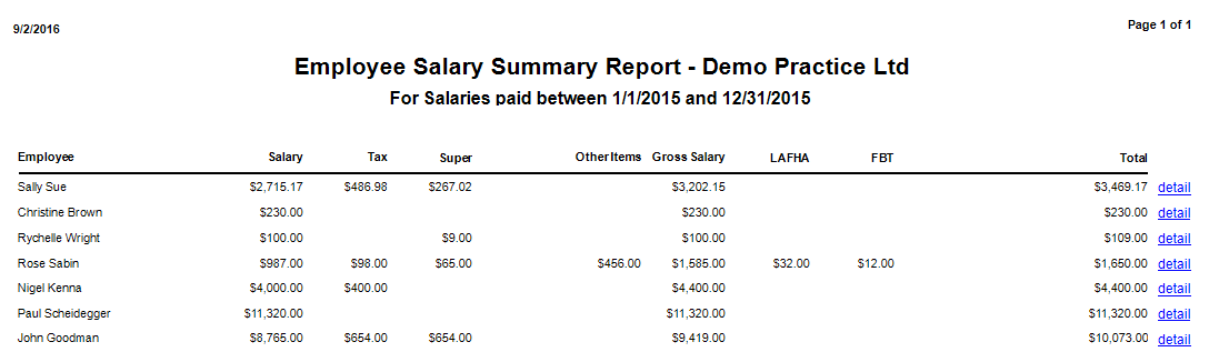 This report provides a summarised report of Salaries for a particular employee (1 line per employee) between two dates.