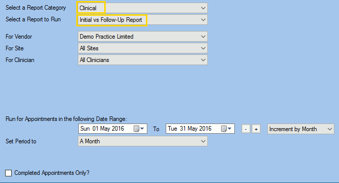 - Then select Initial vs Follow-Up Report in the Report to Run list.