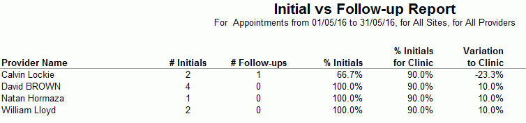 This report shows Initial consultations : Follow-Up consultations ratios, which will allow you to track the retention of patients to the clinic by showing the percentage of initial versus follow-up appointments. The report also provides a variation showing the difference between individual clinician percentages compared to the Clinic average.