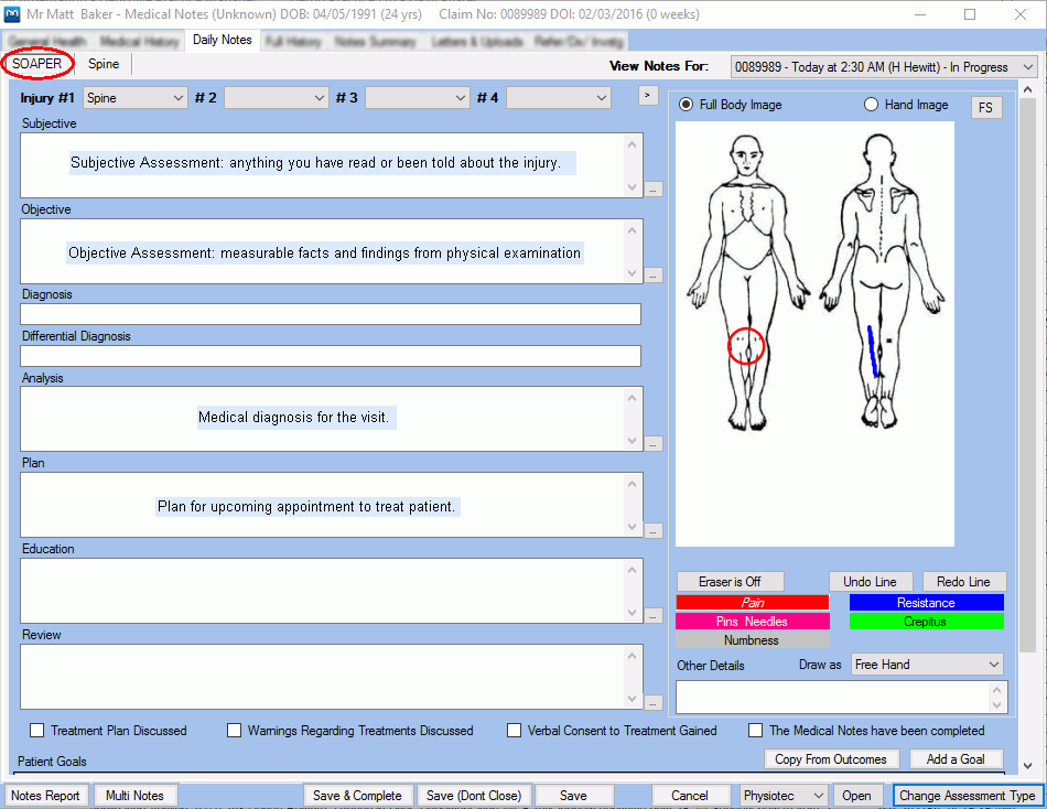 - SOAPER (Subjective Objective Analysis Plan Education Return):