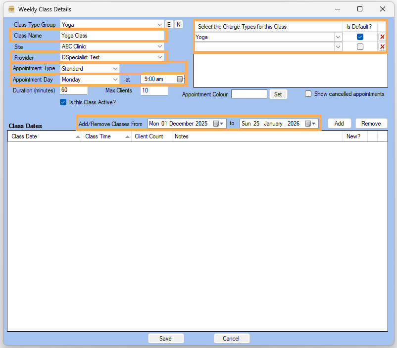 4. Enter Class Name >> Select Provider >> Select Appointment Type >> Select Appointment Day and Time >> Select the Charge Type for this Class