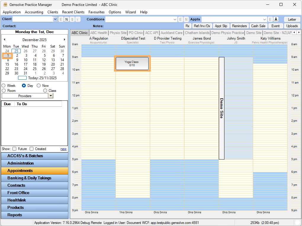 8. Go to Appointments >> According to the Date and Time selected Class will display under that Clinician