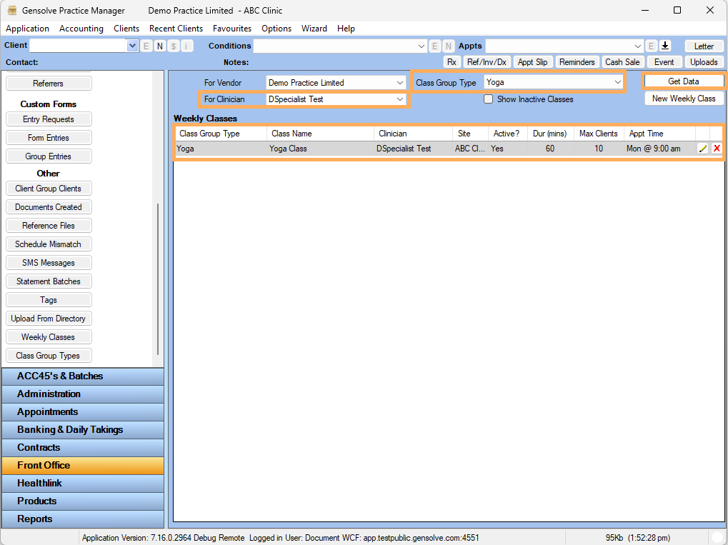 7. Select the Clinician or you can sort by Class Group Type >> Click on Get Data >> Created Weekly Class will display