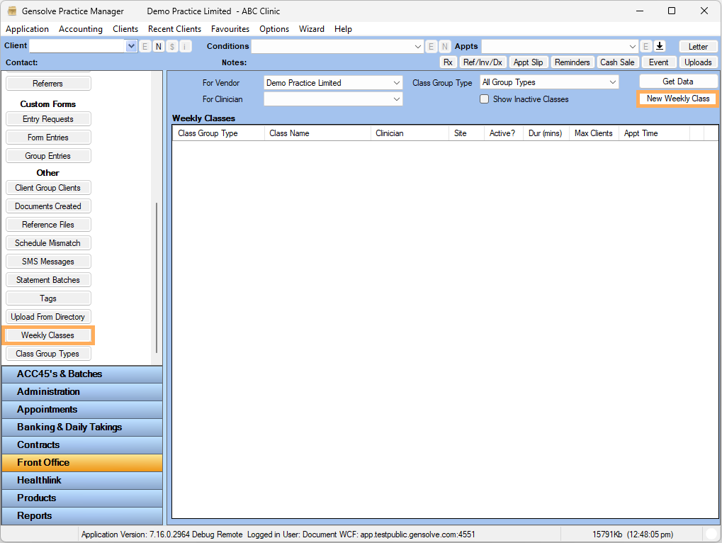 1. Go to Front Office >> Click Weekly Classes >> Click on New Weekly Class
