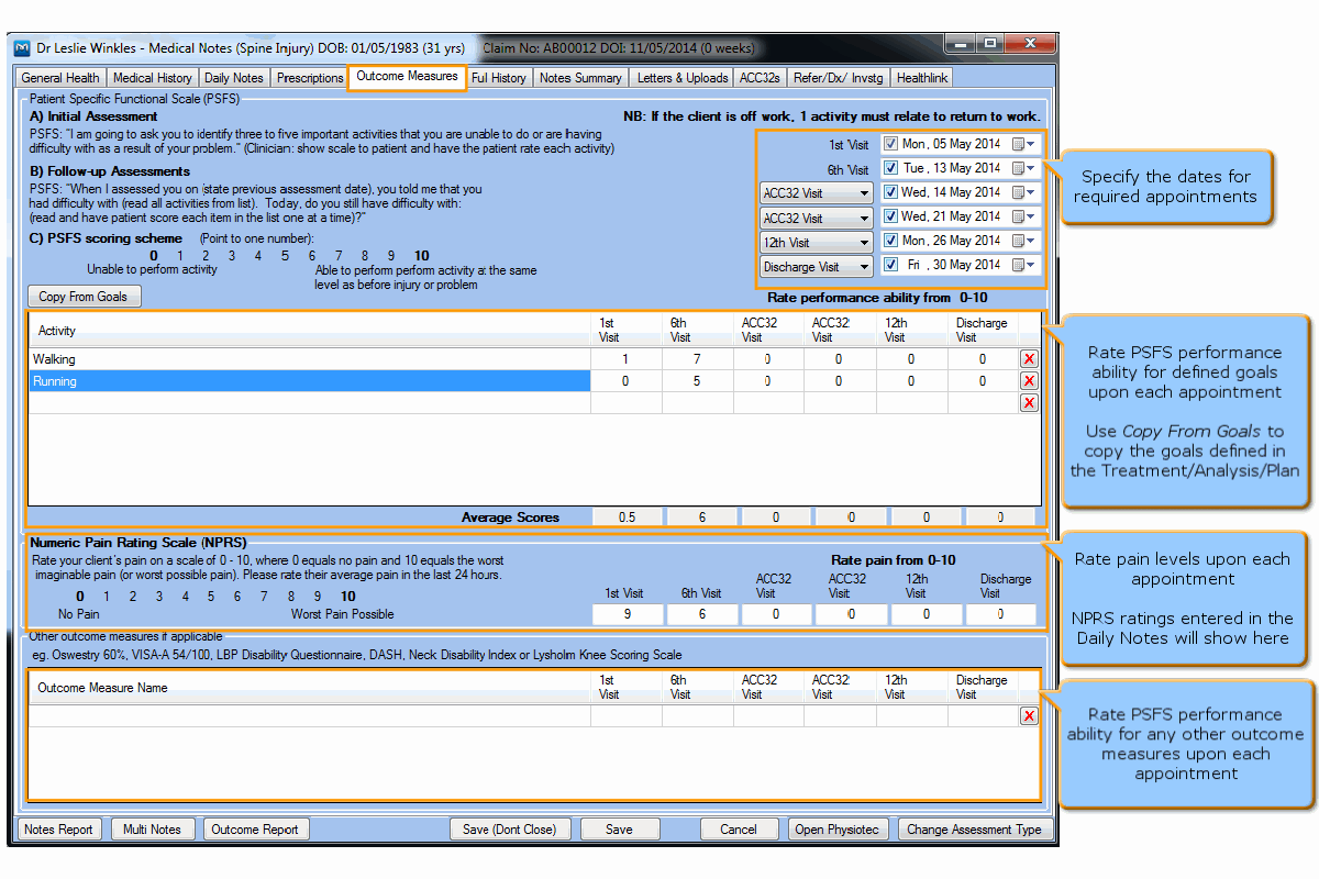 When entering medical notes for a patient's condition following an appointment, you can also select to fill in the Outcome Measures form.