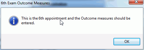 Check the setting Warn when Outcome  Measures are Due to get an alert when Outcome Measures are due on the 1st and 6th visit.