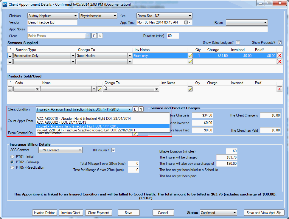 A client condition can be linked to one or more appointments (whether as part of a contract or not).