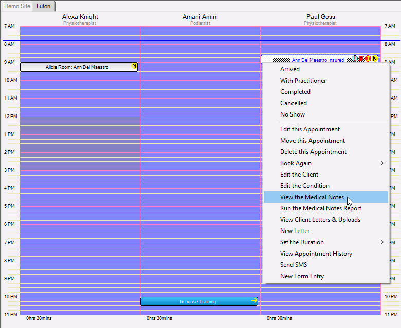 - On the Appointment book, right-mouse click on the appointment created above and select View the Medical Notes to open the Medical Notes window.